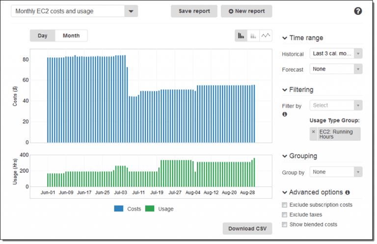 By saving this report we can easily access it later to check on these resources. As a quick way to get you started, AWS has already created some default reports for you like “Monthly cost by service” or “Monthly EC2 running hours costs and usage”.