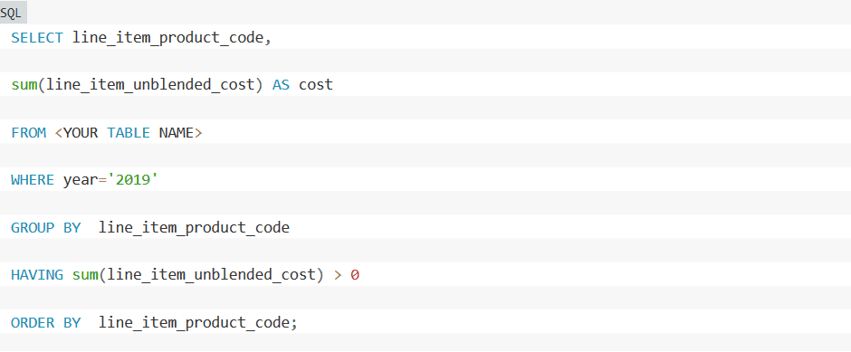 When creating a Report, you can also enable data integration with services like Athena, Redshift or QuickSight. By integrating this data, you are able to perform various query operations. For example, getting the total spend per product for 2019.